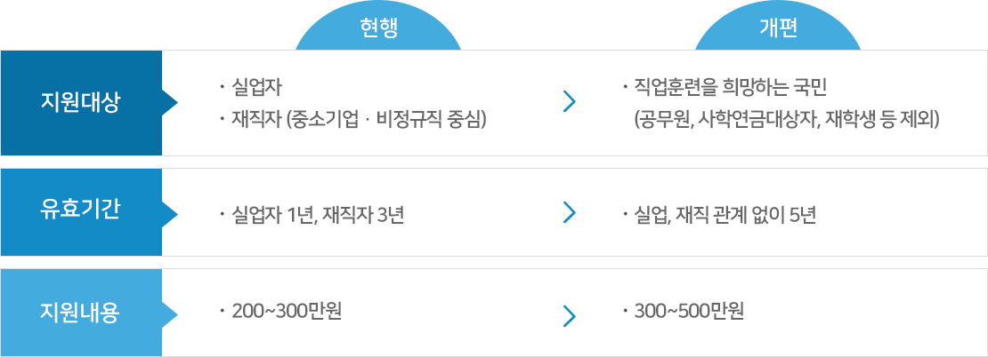 실업, 재직, 자영업 여부에 관계 없이 국민내일배움카드 한 장으로 5년간 사용 가능